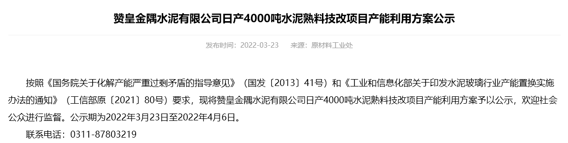 ? 3月23日,河北省工信廳發(fā)布了《贊皇金隅水泥有限公司日產(chǎn)4000噸水泥熟料技改項(xiàng)目產(chǎn)能利用方案公示》。公示內(nèi)容顯示,贊皇金隅水泥將退出旗下兩條熟料生產(chǎn)線,用于新建一條4000t/d水泥熟料生產(chǎn)線,新建生產(chǎn)線將于2024年底前點(diǎn)火投產(chǎn)。本次技改產(chǎn)能利用比例為1:1。