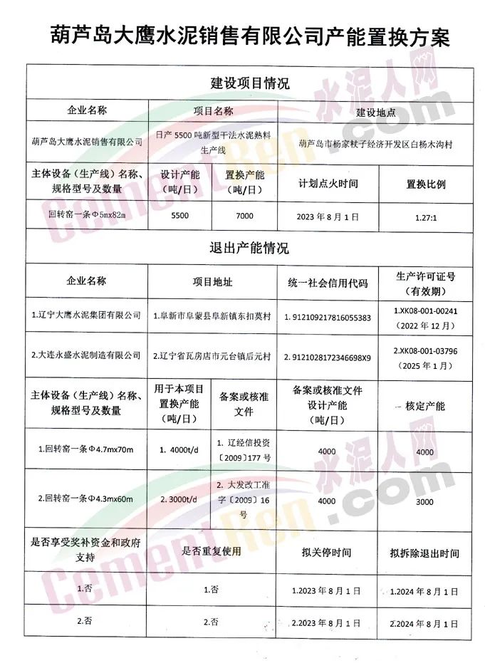 3月22日,遼寧省工信廳發(fā)布《關(guān)于葫蘆島大鷹水泥銷售有限公司5500噸/日水泥熟料生產(chǎn)線產(chǎn)能置換的通告》,葫蘆島大鷹水泥銷售公司將通過(guò)退出遼寧大鷹水水泥集團(tuán)和大連永盛水泥制造有限公司4000t/d和3000t/d兩條熟料生產(chǎn)線,用于新建一條5500t/d水泥熟料生產(chǎn)線。并計(jì)劃于2023年8月1日點(diǎn)火投產(chǎn),置換比例1.27:1。