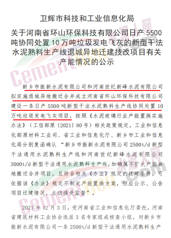 公示文件稱,新鄉(xiāng)市振新水泥有限公司和河南世紀(jì)新峰水泥有限公司擬實施退城異地搬遷合并成立河南省環(huán)山環(huán)保科技有限公司建設(shè)一條日產(chǎn)5500噸新型干法水泥熟料生產(chǎn)線協(xié)同處置10萬噸垃圾發(fā)電飛灰項目,按照《水泥玻璃行業(yè)產(chǎn)能置換實施辦法》(工信部原〔2021〕80號)相關(guān)政策規(guī)定,工業(yè)和信息化部原材料工業(yè)司、省工業(yè)和信息化廳、新鄉(xiāng)市工業(yè)和信息化局分別復(fù)函確認(rèn) “新鄉(xiāng)市振新水泥有限公司2500t/d新型干法通用水泥熟料生產(chǎn)線和河南世紀(jì)新峰水泥有限公司3000t/d新型干法通用水泥熟料生產(chǎn)線,如確屬不擴(kuò)大產(chǎn)能異地搬遷合并項目,且符合相關(guān)《辦法》規(guī)定的遷建條件,可依據(jù)該《辦法》規(guī)定不制定產(chǎn)能置換方案,但應(yīng)公示、公告項目遷建情況,主動接受監(jiān)督”。