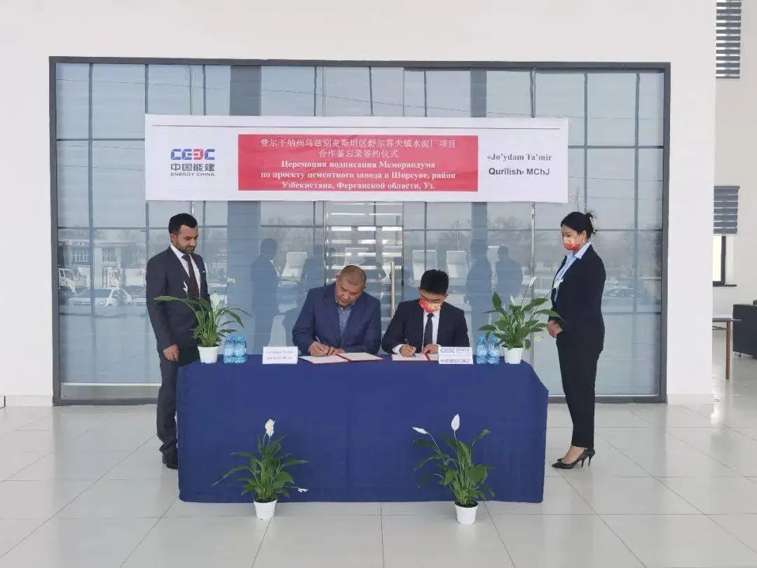 中國能建國際集團與烏茲別克斯坦喬伊丹姆房屋建設有限公司簽署費爾干納州烏茲別克斯坦區舒爾蘇夫鎮水泥廠項目合作協議。費爾干納州州長參與見簽。