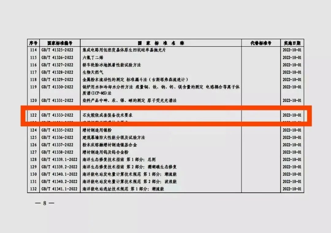 3月9日,國家市場監督管理總局(國家標準化管理委員會)批準發布GB/T 41333-2022《石灰煅燒成套裝備技術要求》國家標準,該標準自2022年10月1日起正式實施,西礦環保參與編制。