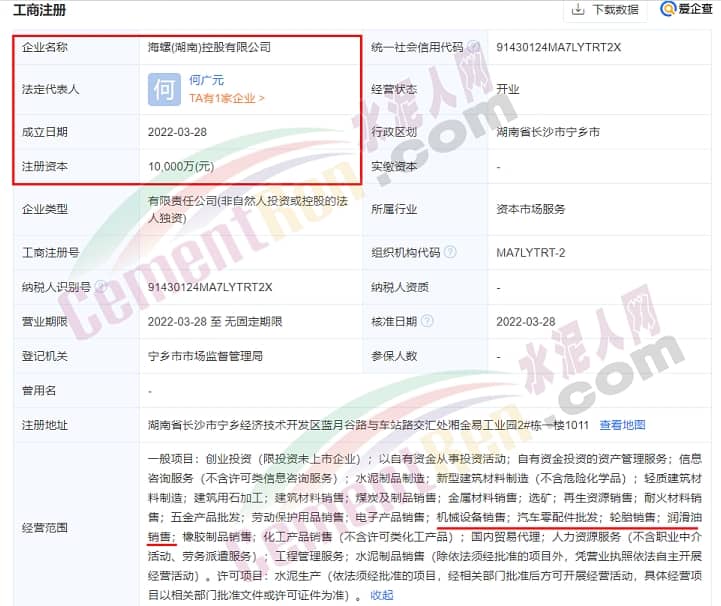 海螺(湖南)控股有限公司于2022年3月28日成立,法定代表人為何廣元,注冊資本1億元,經營范圍包含電子產品銷售;機械設備銷售;汽車零配件批發;輪胎銷售;潤滑油銷售等。企查查股權穿透顯示,該公司由海螺水泥100%控股。