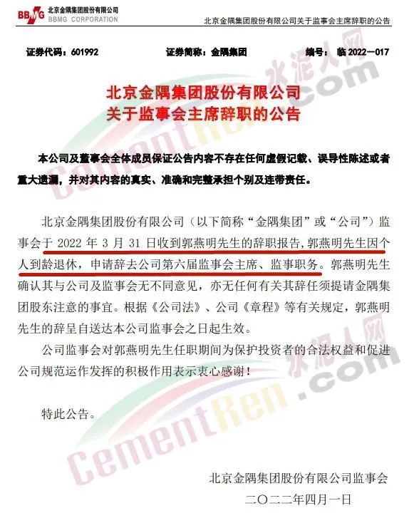 4月1日,金隅集團(tuán)發(fā)布公告稱其監(jiān)事會于2022年3月31日收到郭燕明先生的辭職報告,郭燕明先生因個人到齡退休,申請辭去公司第六屆監(jiān)事會主席、監(jiān)事職務(wù)。具體公告如下: