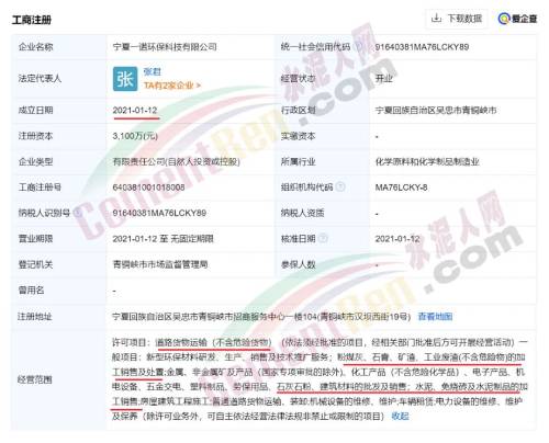 據查詢,寧夏一諾環??萍加邢薰境闪⒂?021年01月12日,注冊地位于寧夏回族自治區吳忠市青銅峽市招商服務中心一樓104(青銅峽市漢壩西街19號),法定代表人為張君。經營范圍包括許可項目為道路貨物運輸。一般項目中包含粉煤灰、石膏、礦渣、工業廢渣的加工銷售及處置;水泥、免燒磚及水泥制品的加工銷售等。