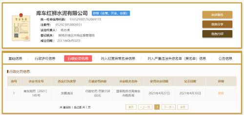 庫車紅獅水泥有限公司因發票違法被國家稅務總局庫車市稅務局于2021年4月27日處罰1500元。主要違法事實為“虛開發票”。