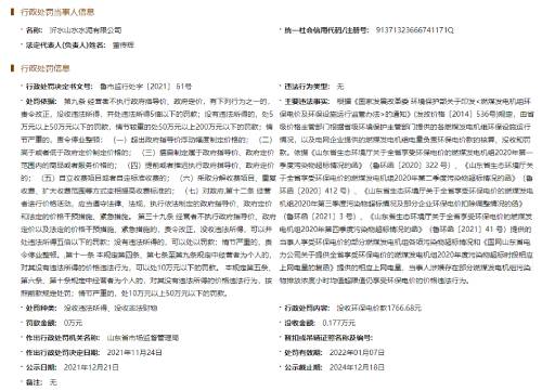 沂水山水水泥有限公司2021年11月24日被山東省市場監管局處罰。沒收環保電價款1766.68元。違法事實為當事人涉嫌存在部分燃煤發電機組污染物排放濃度小時均值超限值仍享受環保電價的價格違法行為。