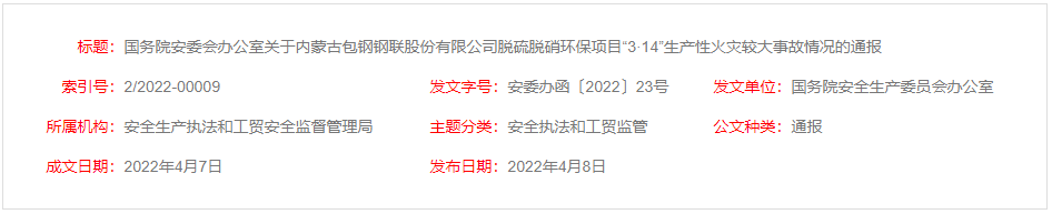 近日,國(guó)務(wù)院安委會(huì)辦公室通報(bào)了關(guān)于內(nèi)蒙古包鋼鋼聯(lián)股份有限公司脫硫脫硝環(huán)保項(xiàng)目“3·14”生產(chǎn)性火災(zāi)較大事故的情況。