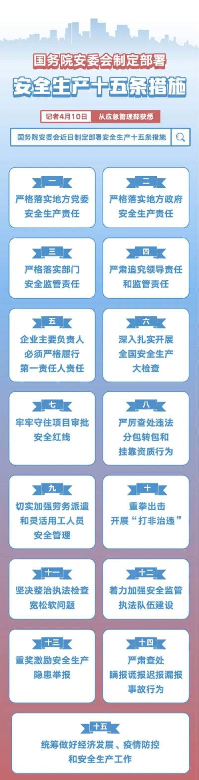 國務院安委辦有關負責人介紹,國務院安委會梳理相關法律法規已有規定、以往管用舉措和近年來針對新情況采取的有效措施,制定了進一步強化安全生產責任落實、堅決防范遏制重特大事故的十五條措施,部署發動各方面力量全力抓好安全防范工作。