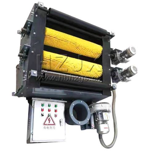 智能負(fù)壓刷料裝置主要由刷輪、傳動組件以及風(fēng)刀、微動力除塵器、電控箱等組成。