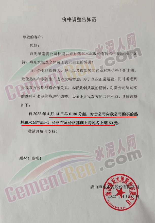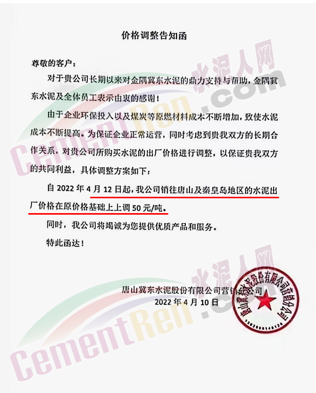 唐山冀東水泥股份有限公司唐山營銷分公司通知自4月12日起,公司銷往唐山及秦皇島地區地水泥出廠價在原價基礎上上調50元/噸。