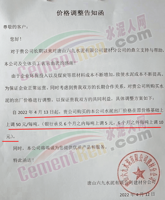 唐山六九水泥有限公司建材分公司通知自4月13日起,上調水泥價格50元/噸,銀行承兌6個月之內上調5元/噸,6個月之外上調10元/噸。