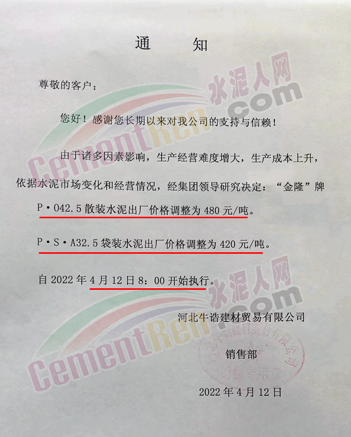 河北牛誥建材貿易有限公司通知由于諸多因素影響,生產經營難度增大 ,生產成本上升,依據水泥市場變化和經營情況,經集團領導研究決定,自4月12日8時起“金隆”牌P.O42.5散裝水泥出廠價480元/噸,P.S.A32.5袋裝水泥出廠價調整為420元/噸。