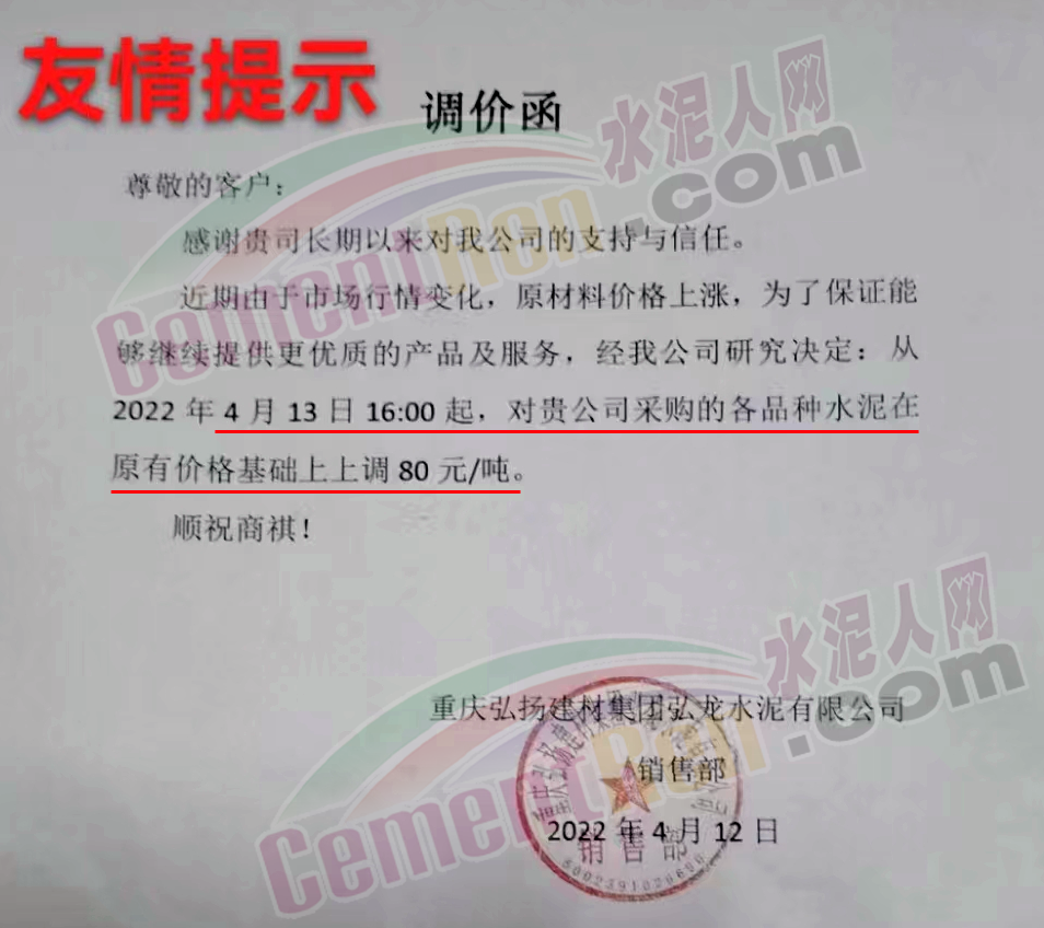 重慶弘揚建材集團弘龍水泥有限公司通知,由于市場行情變化,原材料價格上漲,為了保證能夠繼續提供更優質的產品及服務,經公司研究決定從4月13日16時起,上調各品種水泥價格80元/噸。