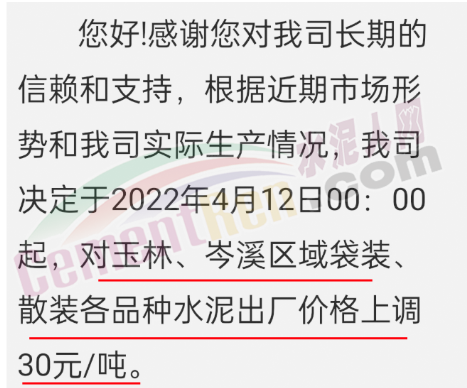 河北中達集團有限責任公司水泥廠通知由于疫情原因各原材料供應不足,價格持續上漲,環保管控力度加大等諸多因素影響,生產經營難度增大,生產成本上升,為保證公司的正常生產經營,各品種水泥自4月12日上午8時在原價基礎上上調30元/噸。