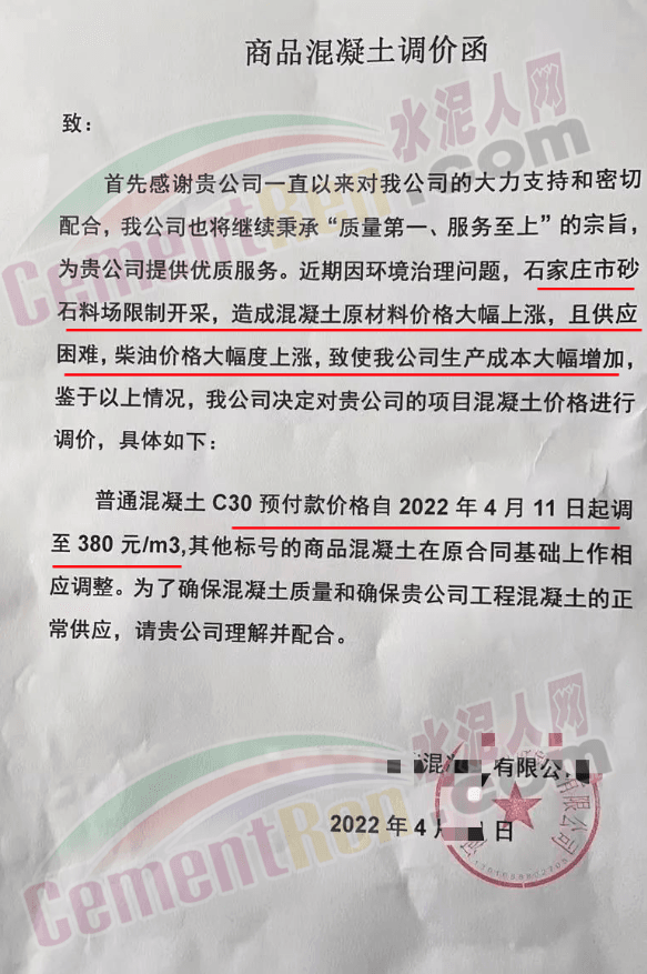 另一企業通知稱,近期因環境治理問題,石家莊市砂石料場限制開采,造成混凝土原材料價格大幅上漲,且供應困難,柴油價格大幅度上漲,致使公司生產成本大幅增加,鑒于以上情況,公司決定自4月11日起普通混凝土C30預付款價格調至380元/立方。其他標號的商品混凝土在原合同基礎上作相應調整 。