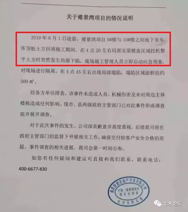 坍塌后,建設單位發布緊急通報,極力澄清車庫坍塌不會影響主樓結構安全,通報稱第一時間上報政府相關監管部門,隨即住建部門委派了湖南大學結構專家去事發項目進行了實地勘察;