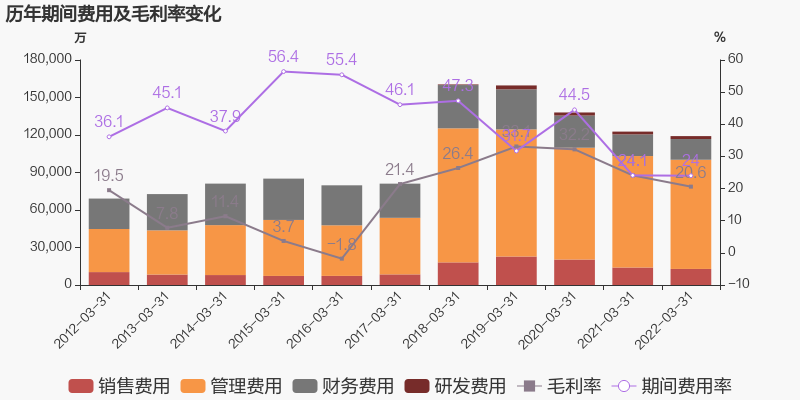 公司2022一季度營業成本39.5億,同比上升2%,營業收入同比下降2.5%,毛利率下降3.5%。期間費用率為24%,同去年相比變化不大。經營性現金流由4.2億下降至-7億,同比下降267.3%。