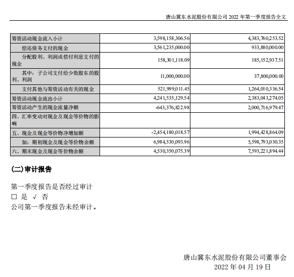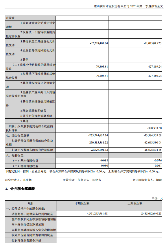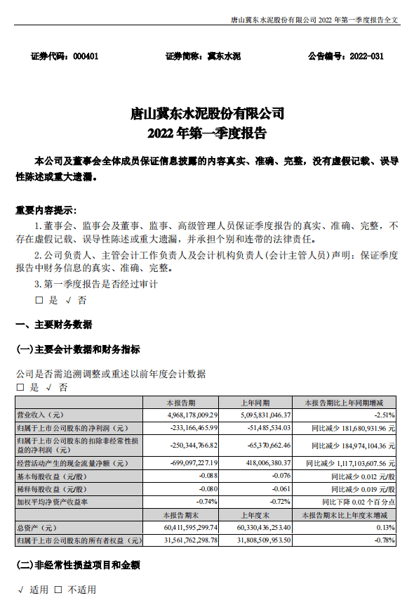 冀東水泥于2022年4月20日披露一季報,公司2022年一季度實現營業總收入49.7億,同比下降2.5%;實現歸母凈利潤-2.3億,上年同期為-5148.6萬元,虧損幅度擴大。