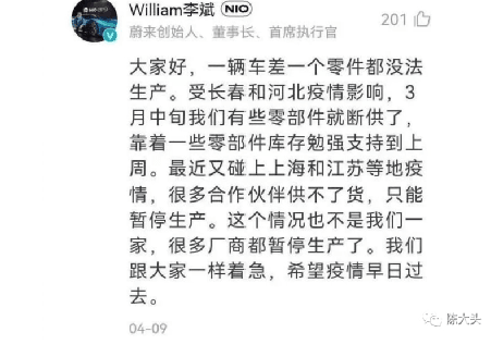 4月9日,蔚來汽車公開表示,蔚來位于吉林,上海,江蘇等地的供應(yīng)鏈伙伴已經(jīng)陸續(xù)停產(chǎn),零部件無法到位,導(dǎo)致整車停止生產(chǎn)!