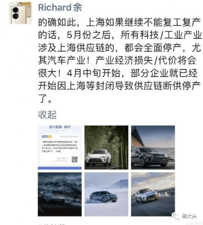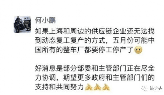 小鵬汽車董事長(zhǎng)何小鵬在朋友圈發(fā)文稱,如果上海和周邊的供應(yīng)鏈企業(yè)還無法找到動(dòng)態(tài)復(fù)工復(fù)產(chǎn)的方式,五月份可能中國(guó)所有的整車廠都要停工停產(chǎn)了。
