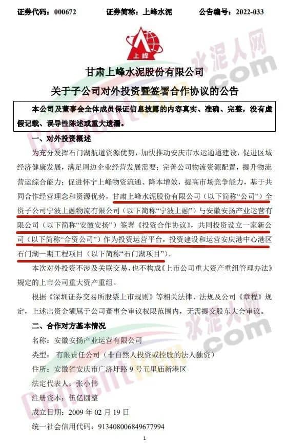 日前,上峰水泥發布公告,為充分發揮石門湖航道資源優勢,加快推動安慶市水運通道建設,促進區域經濟健康發展,滿足周邊企業經營發展需要;完善公司物流資源配置,提升物流營運綜合能力;促進懷寧上峰物資流通、降本增效,提高市場競爭能力,基于共同合作經營理念和資源優勢,公司全資子公司寧波上融物流有限公司與安徽安揚產業運營有限公司簽署《投資合作協議》,共同投資設立一家新公司作為投資運營平臺,投資建設和運營安慶港中心港區石門湖一期工程項目。