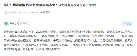 冀東水泥回復(fù):2022年第一季度公司業(yè)績(jī)同比增虧,一是公司所在區(qū)域受新冠疫情多點(diǎn)爆發(fā)及錯(cuò)峰生產(chǎn)力度加大的影響,導(dǎo)致公司總體開(kāi)工率較低和水泥銷量同比減少;二是受原煤采購(gòu)價(jià)格上漲影響,產(chǎn)品銷售成本同比上升。