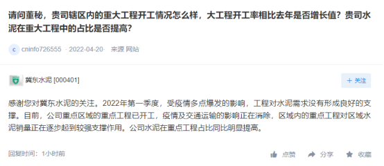 冀東水泥回復(fù):公司主要產(chǎn)能及市場(chǎng)處于北方區(qū)域,一季度屬銷售淡季加之疫情多發(fā)影響,公司水泥及熟料銷量下降,是公司第一季度虧損的主要原因。