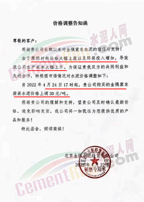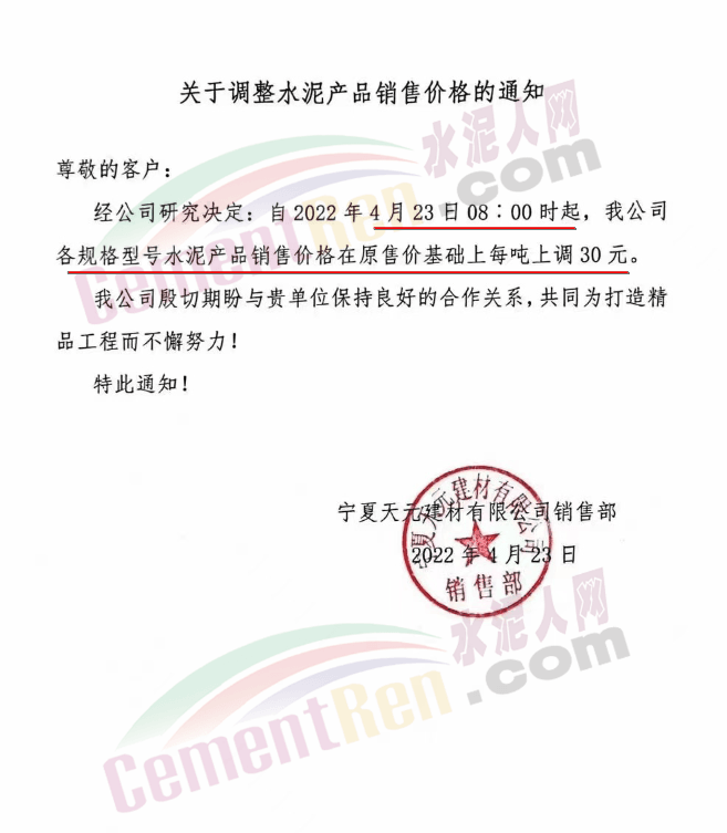 寧夏天元建材有限公司銷售部通知,自2022年4月23日8時起,公司各規格型號水泥產品銷售價格在原售價基礎上每噸上調30元。