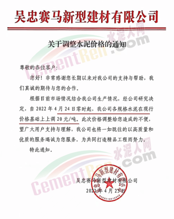 吳忠賽馬新型建材有限公司通知,根據目前市場況結合公司生產情況,自2022年4月24日零時起,公司各規格水泥在現行價格基礎上上調20元/噸。