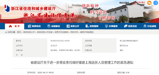 浙江省住建廳發關于做好援建上海返浙人員管理工作的緊急通知