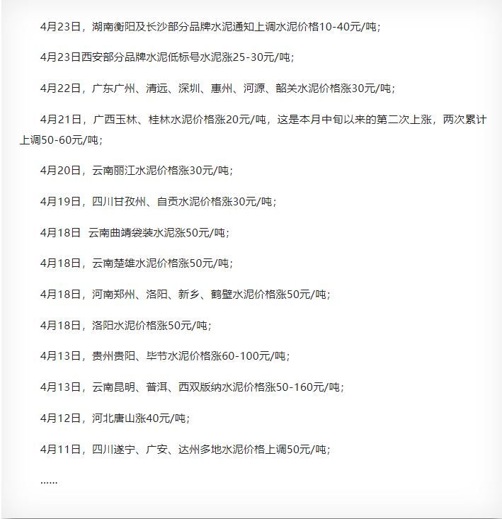 混凝土方面,跟隨水泥漲價同步推漲。4月21日,云南普洱混凝土價格漲10元/方;4月19日,云南麗江混凝土價格漲20元/方;4月18日,廣東云浮混凝土價格漲20元/方;4月12日,石家莊混凝土價格漲30元/方……