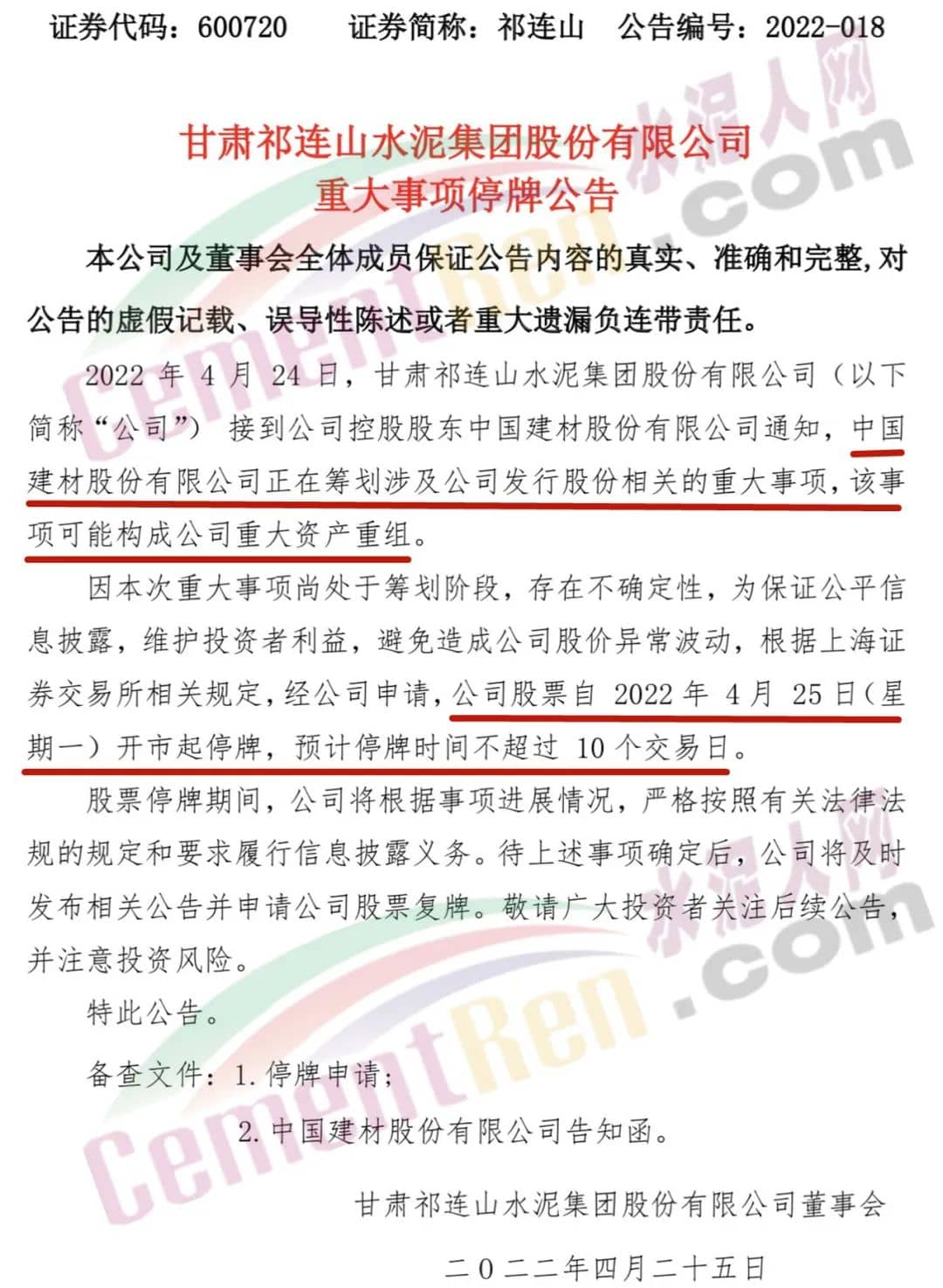 4月25日,甘肅祁連山水泥集團股份有限公司發布公告稱,中國建材股份有限公司正在籌劃涉及祁連山水泥發行股份相關的重大事項,該事項可能構成公司重大資產重組。祁連山水泥股票自2022年4月25日開市起停牌,預計停牌時間不超過10個交易日。