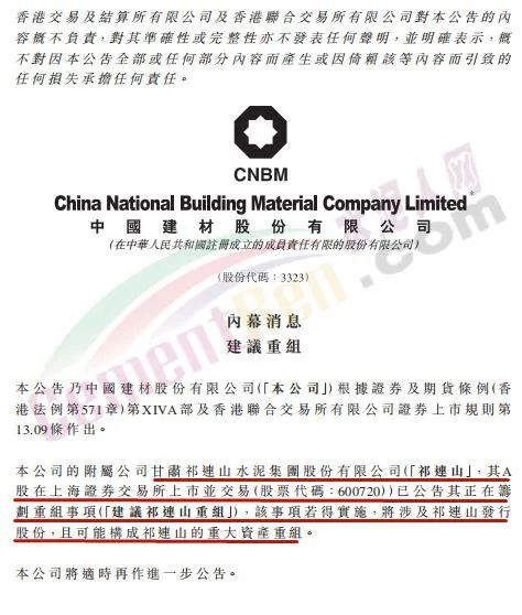 同日,中國建材也發布公告,公司附屬公司甘肅祁連山水泥集團股份有限公司已公告其正在籌劃重組事項,該事項若得實施,將涉及祁連山發行股份,且可能構成祁連山的重大資產重組。