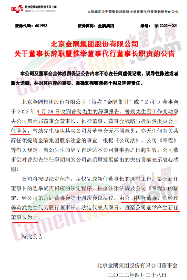 4月27日晚間金隅集團(tuán)發(fā)布公告稱,北京金隅集團(tuán)股份有限公司董事會于 2022 年 4 月 26 日收到曾勁先生的辭職報告。曾勁先生因工作變動辭去公司第六屆董事會董事長、執(zhí)行董事、董事會戰(zhàn)略與投融資委員會主任職務(wù)。