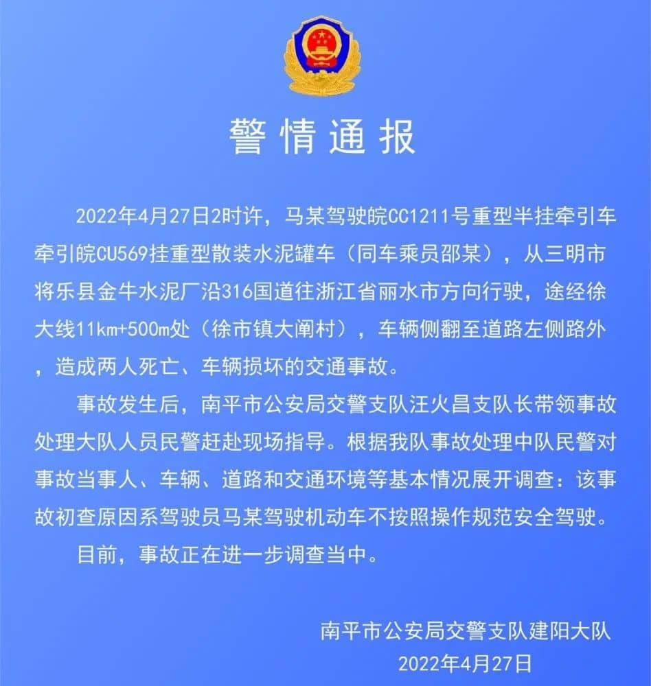 4月27日,福建省南平市公安局交警支隊建陽大隊發(fā)布一則警情通報稱,2022年4月27日2時許,馬某駕駛皖CC1211號重型半掛牽引車牽引皖CU569掛重型散裝水泥罐車(同車乘員邵某),從三明市將樂縣金牛水泥廠沿316國道往浙江省麗水市方向行駛,途經(jīng)徐大線11km+500m處(徐市鎮(zhèn)大闡村), 車輛側翻至道路左側路外造成兩人死亡、車輛損壞的交通事故。