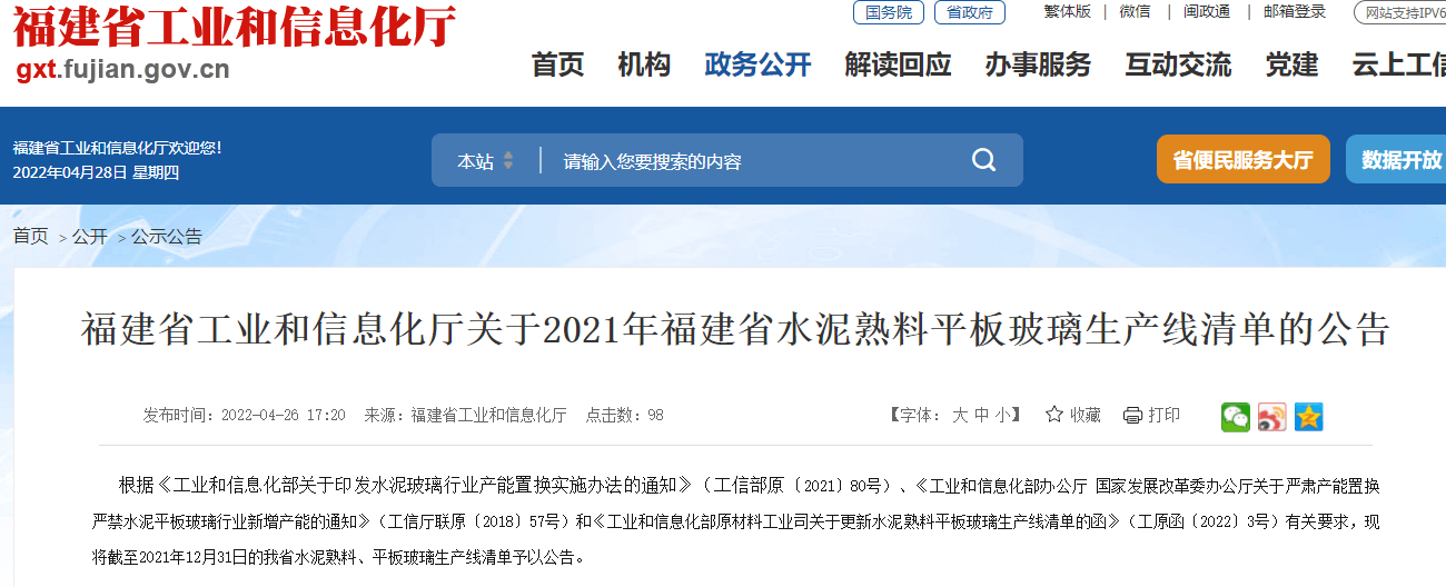 根據(jù)《工業(yè)和信息化部關(guān)于印發(fā)水泥玻璃行業(yè)產(chǎn)能置換實(shí)施辦法的通知》(工信部原〔2021〕80號(hào))、《工業(yè)和信息化部辦公廳 國家發(fā)展改革委辦公廳關(guān)于嚴(yán)肅產(chǎn)能置換 嚴(yán)禁水泥平板玻璃行業(yè)新增產(chǎn)能的通知》(工信廳聯(lián)原〔2018〕57號(hào))和《工業(yè)和信息化部原材料工業(yè)司關(guān)于更新水泥熟料平板玻璃生產(chǎn)線清單的函》(工原函〔2022〕3號(hào))有關(guān)要求,現(xiàn)將截至2021年12月31日的我省水泥熟料、平板玻璃生產(chǎn)線清單予以公告。