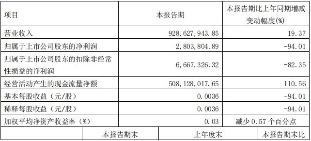 4月26日,甘肅祁連山水泥集團(tuán)股份有限公司 發(fā)布2022年第一季度業(yè)績(jī)報(bào)告稱,公司第一季度實(shí)現(xiàn)營(yíng)業(yè)收入928,627,943.85元,同比增長(zhǎng)19.37%;歸屬于上市公司股東的凈利潤(rùn)2,803,804.89元,同比下降94.01%。
