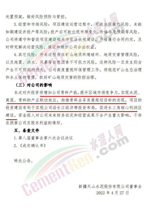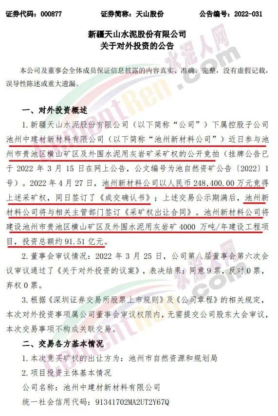4月27日晚,天山股份公告,控股子公司池州新材料公司以24.84億元競得池州市貴池區橫山礦區及外圍水泥用灰巖礦采礦權。待《采礦權出讓合同》簽訂后,池州新材料公司將建設“池州市貴池區橫山礦區及外圍水泥用灰巖礦4000萬噸/年建設工程項目”,投資總額約91.51億元,此次投資將增加公司骨料產能。