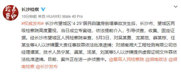 據湖南省長沙市人民檢察院官方微博消息,長沙居民自建房倒塌事故發生后,長沙市、望城區兩級檢察院高度重視,當日成立專案組,依法提前介入,引導偵查,收集、固定證據。