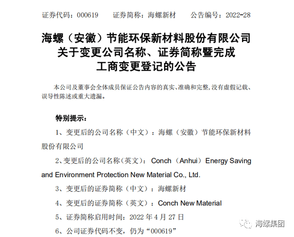 經工商行政部門審核登記和深圳證券交易所核準,4月27日,“蕪湖海螺型材科技股份有限公司”公司名稱正式變更為“海螺(安徽)節能環保新材料股份有限公司”,公司股票簡稱由“海螺型材”變更為“海螺新材”。變更后,公司名稱與主營業務更相匹配,凸顯公司產業節能環保屬性,更加準確地詮釋了公司未來發展方向,將有效提升公司品牌認知度和行業影響力。
