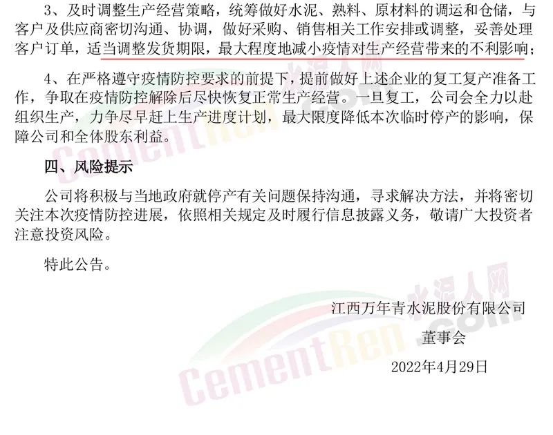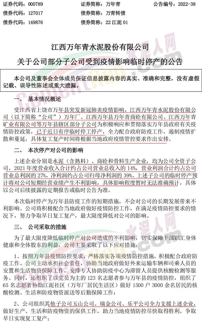 上述企業(yè)分別是水泥(含熟料)、商砼和骨料生產企業(yè),均為公司全資子公司,2021年度營業(yè)收入合計約占公司營業(yè)總收入的14%,營業(yè)利潤合計約占公司營業(yè)總利潤的27%,凈利潤約占公司歸母凈利潤的39%。上述子公司的臨時停產預計將對公司短期經營業(yè)績產生不利影響,具體影響程度暫時無法準確預計,具體以公司后續(xù)披露的定期報告或臨時公告為準。