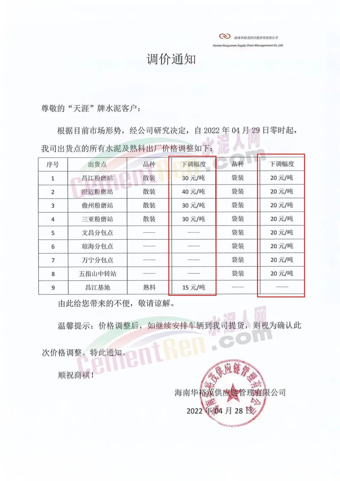 海南華裕茂供應(yīng)鏈管理有限公司發(fā)函通知“天涯”牌水泥客戶(hù)稱(chēng),根據(jù)目前市場(chǎng)形勢(shì),經(jīng)公司研究決定,自 2022年4月29日零時(shí)起,公司出貨點(diǎn)的所有水泥及熟料出廠(chǎng)價(jià)格下調(diào)20-40元/噸。