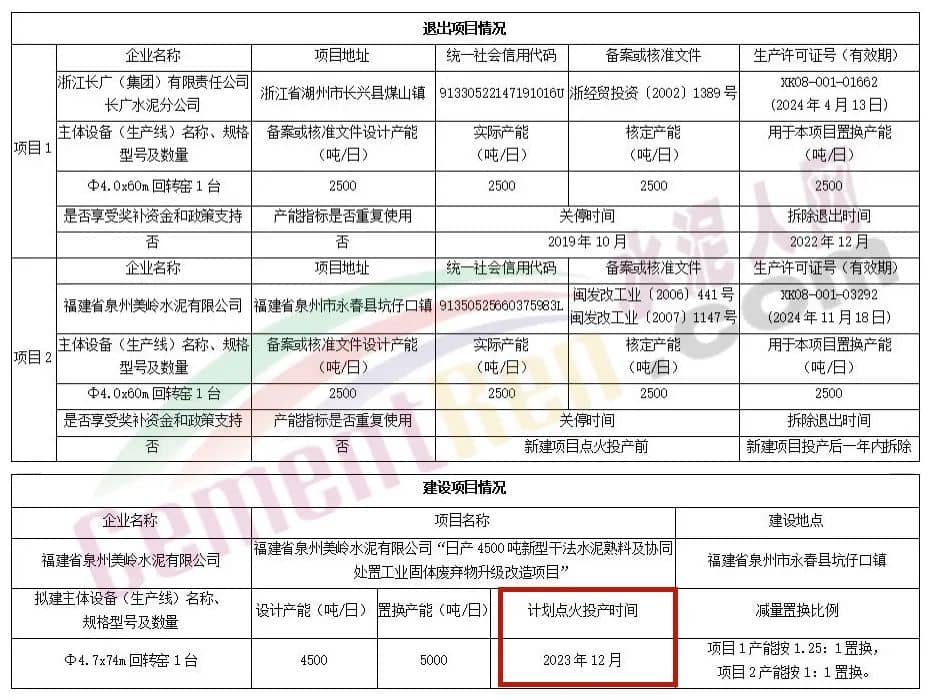 據(jù)水泥人網(wǎng)了解,此前,福建省工信廳曾發(fā)布《關(guān)于福建省泉州美嶺水泥有限公司日產(chǎn)4500噸新型干法水泥熟料生產(chǎn)線建設(shè)項目產(chǎn)能置換方案的公告》,公告顯示,福建省泉州美嶺水泥有限公司“日產(chǎn)4500噸新型干法水泥熟料及協(xié)同處置工業(yè)固體廢棄物升級改造項目”由浙江長廣(集團(tuán))有限責(zé)任公司長廣水泥分公司2500t/d和福建省泉州美嶺水泥有限公司2500t/d分別按照1.25:1和1:1的置換比例置換而來。計劃點火投產(chǎn)時間為2023年12月。