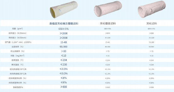 鴻盛高強(qiáng)度芳綸梯次覆膜濾料與普通濾料參數(shù)對(duì)比