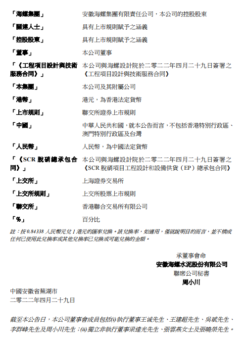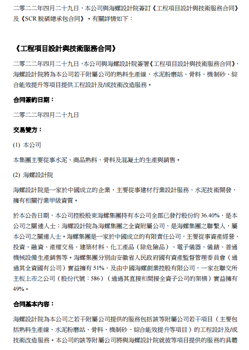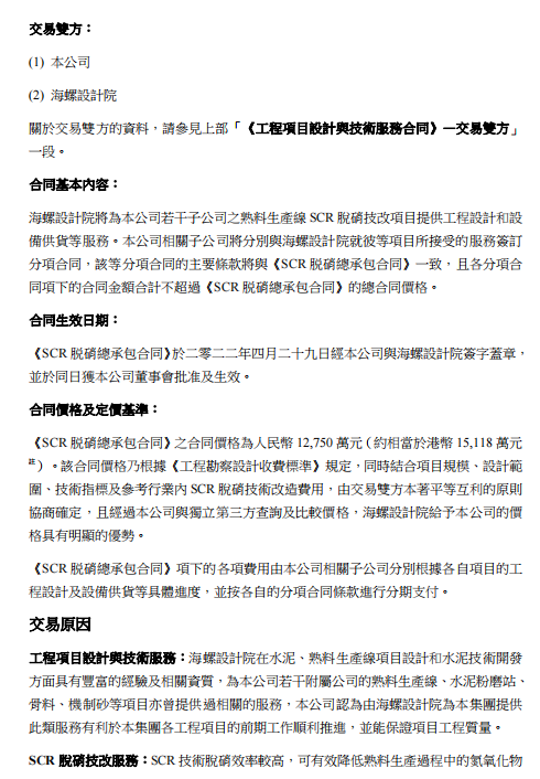 SCR脫硝技改服務,2022年4月29日,本公司與海螺設計院簽署《SCR脫硝總承包合同》,根據該合同,海螺設計院將為本公司若干子公司之熟料生產線提供SCR脫硝技術改造服務,注合同價格為人民幣12,750萬元(約相當于港幣15,118萬元)。