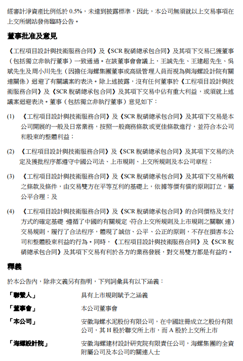 海螺設計院為本公司控股股東海螺集團之全資附屬公司,因此,海螺設計院為海螺集團之聯系人,是本公司之關連人士。因此,根據上市規則第14A章,《工程項目設計與技術服務合同》及《SCR脫硝總承包合同》項下的交易構成本公司之關連交易。