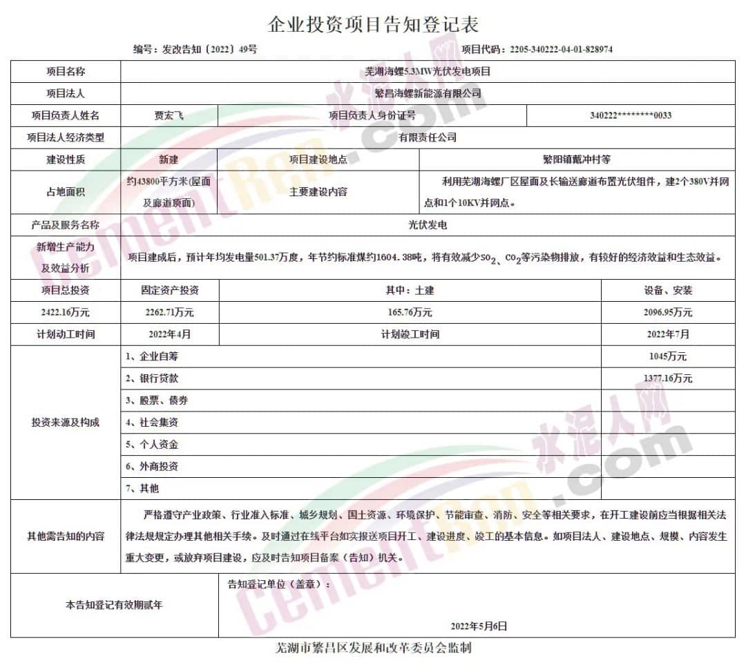 日前,蕪湖市政府官網(wǎng)發(fā)布了《繁昌海螺新能源有限公司蕪湖海螺5.3MW光伏發(fā)電項目企業(yè)投資項目告知書》。由繁昌海螺新能源有限公司投資建設(shè)的蕪湖海螺5.3MW光伏發(fā)電項目成功獲批。