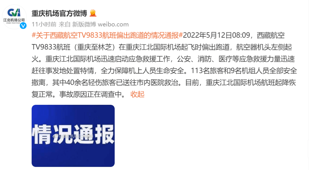 10時許,重慶機場官方微博通報:2022年5月12日08:09,西藏航空TV9833航班(重慶至林芝)在重慶江北國際機場起飛時偏出跑道,航空器機頭左側起火。重慶江北國際機場迅速啟動應急救援工作,公安、消防、醫療等應急救援力量迅速趕往事發地處置特情,全力保障機上人員生命安全。