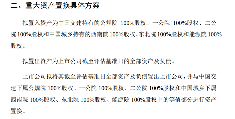 首先,公司擬將其截至評估基準日全部資產及負債置出上市公司,并與中國交建下屬公規院100%股權、一公院 100%股權、二公院100%股權和中國城鄉下屬西南院 100%股權、東北院100%股權、能源院100%股權中的等值部分進行資產置換。