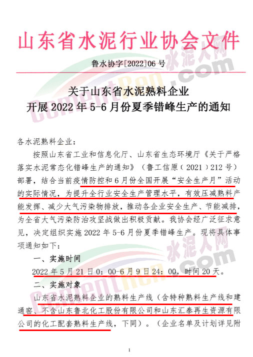 實施時間為2022年5月21日0:00-6月9日24:00,時間20天。實施對象為山東省水泥熟料企業(yè)的熟料生產(chǎn)線(含特種熟料生產(chǎn)線和建通窯、不含山東魯北化工股份有限公司和山東匯泰再生資源有限公司的化工配套熟料生產(chǎn)線)。